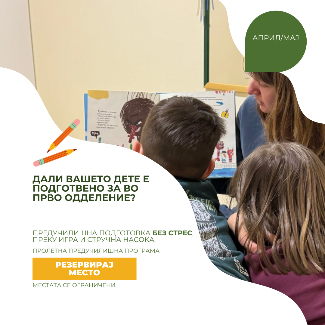 Структурирана тримесечна програма наменета за подготовка на децата за успешен училишен почеток. Се фокусираме на рана писменост, социјални вештини и самостојност, помагајќи им на децата со самодоверба да преминат во училишната средина.
